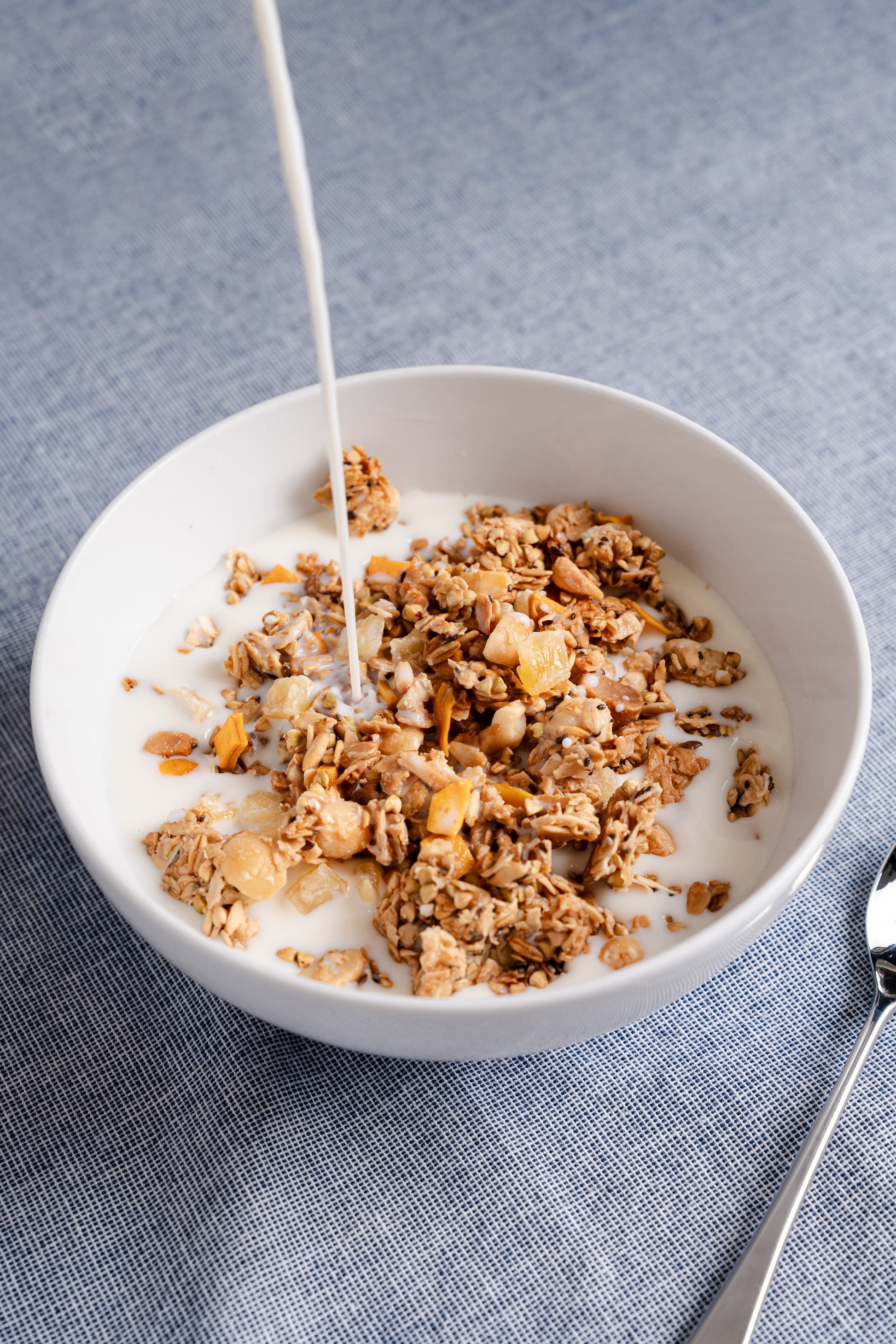 Our Tropical granola brings island vibes to your morning. We start with our organic oat and buckwheat base, baked with maple syrup and coconut oil, then blend in organic mango, coconut, and pineapple for a naturally sweet, brightness. Buttery macadamia nuts round out the mix, adding a lush crunch that's pure sunshine.